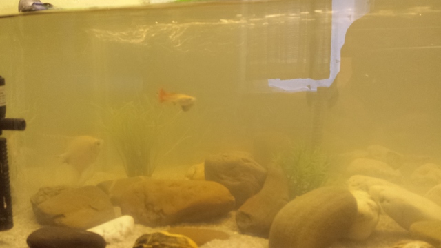 Здравейте имам проблем с водата в моят аквариум и става все по зле водата става все по мътна с всеки изминал ден. аквариумът е стартиран на 31.05.2014г. обемът на аквариумът е 45 литра в него гледам 3 неона 5 гупи и 2 скаларии (малки) имам грунд искуствени растения имам 2 помпи за вода едната е Eheim а другата не знам точно каква е имам нагревател 50W и аератор имам и лампа която свети по 8-10 часа на ден водата вече почти е станала като айрян с вода от както съм пуснал аквариумът не съм сменял вода температурата е 26-28 градуса не съм използвал никаква химия четох някъде че това е било цъфтеж на водата а другаде че така ставало при пускането на нов аквариум и че имало някакъв азотен цикъл които се образувал и за това е така водата нов съм и незнам кое е вярно моля за помощ ето снимки
