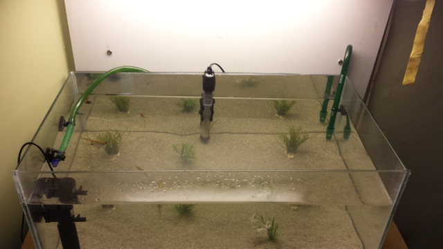 По-добре е ама... сложи си някое и друго живо растение за да нямаш толкова проблеми(препоръчвам ти нещо бързорастящо като валиснерия и егерия).Нагревателя  ти така най-вероятно ще изгори, трябва да е потопен целия под водата.Успех