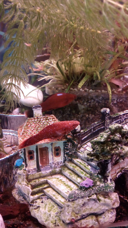 Като пускаш отново аквариума,махаш саксиите,насипваш 4-5-6см пласт пясък фракция около 2-4мм по дъното и садиш растенията директно в него.Не знам  къщурката с моста така,както е боядисана дали не изпуска нещо вредно във водата,може да я смениш с истински камъни например или корени някакви.Имай предвид и времето за азотния цикъл в началото.Успех!