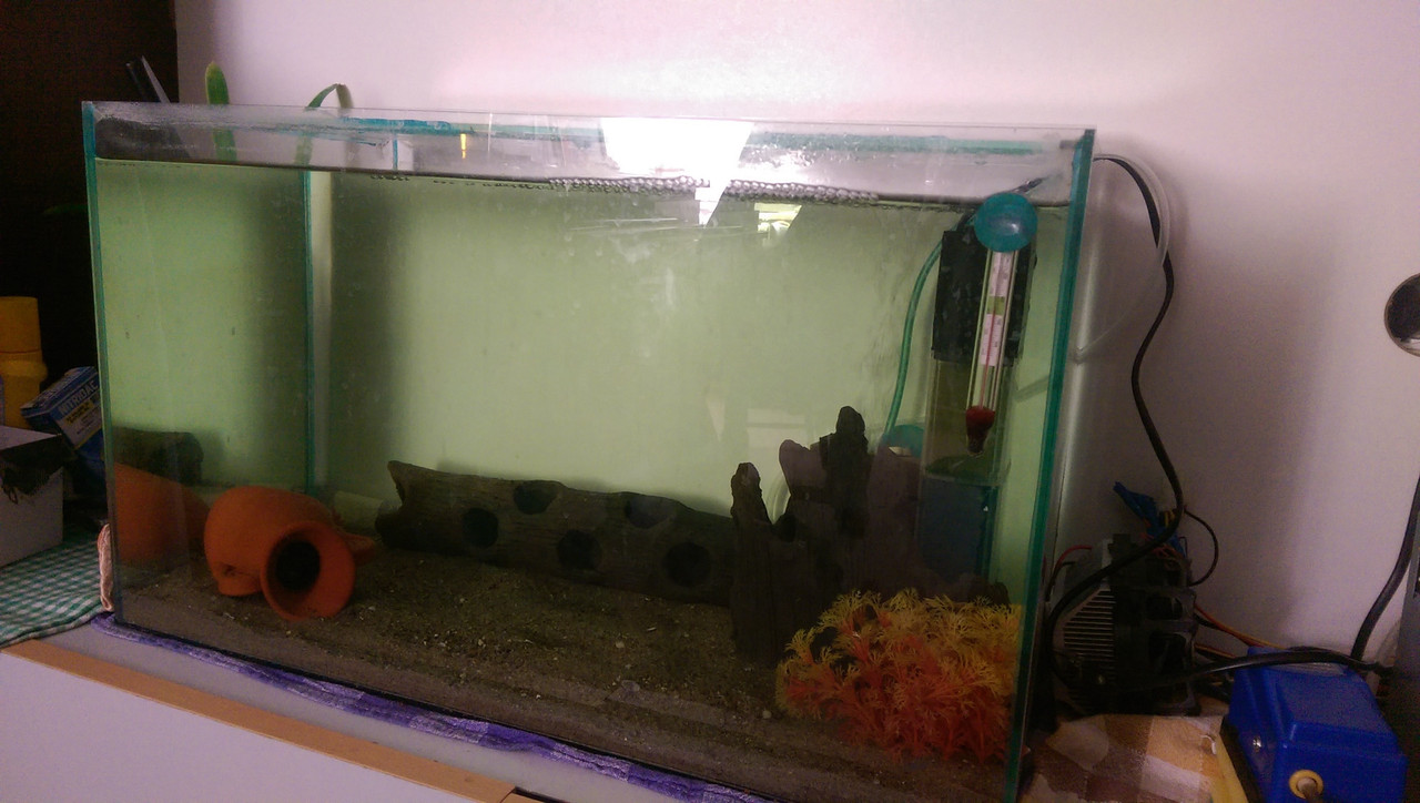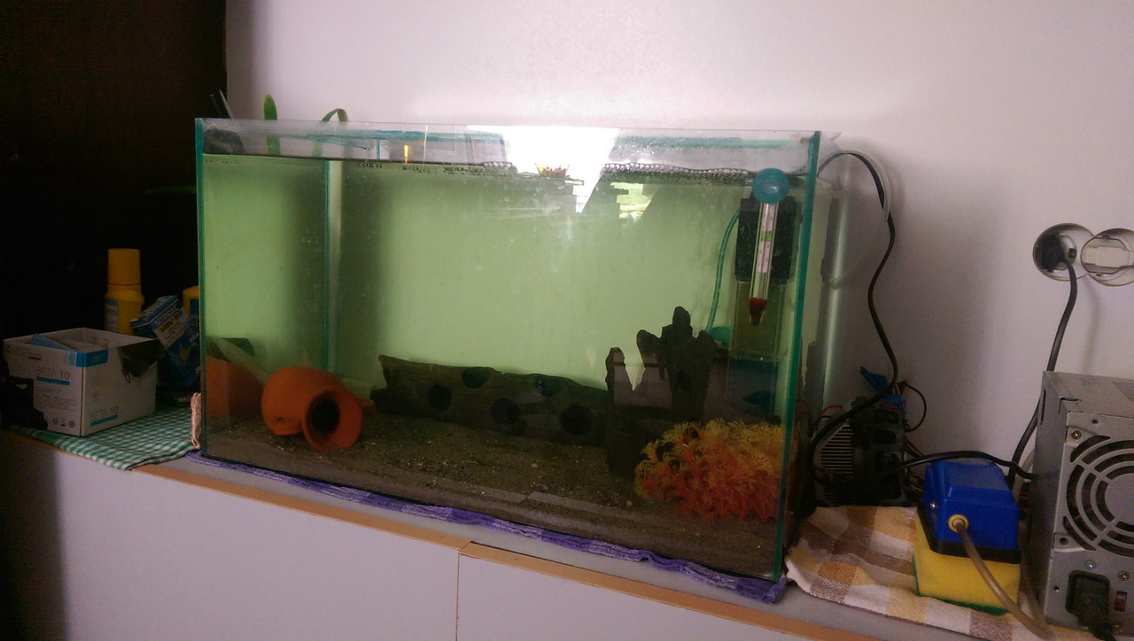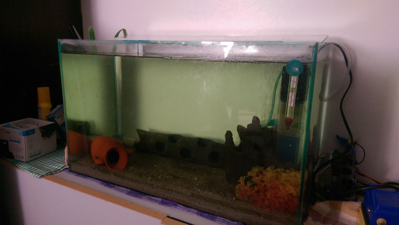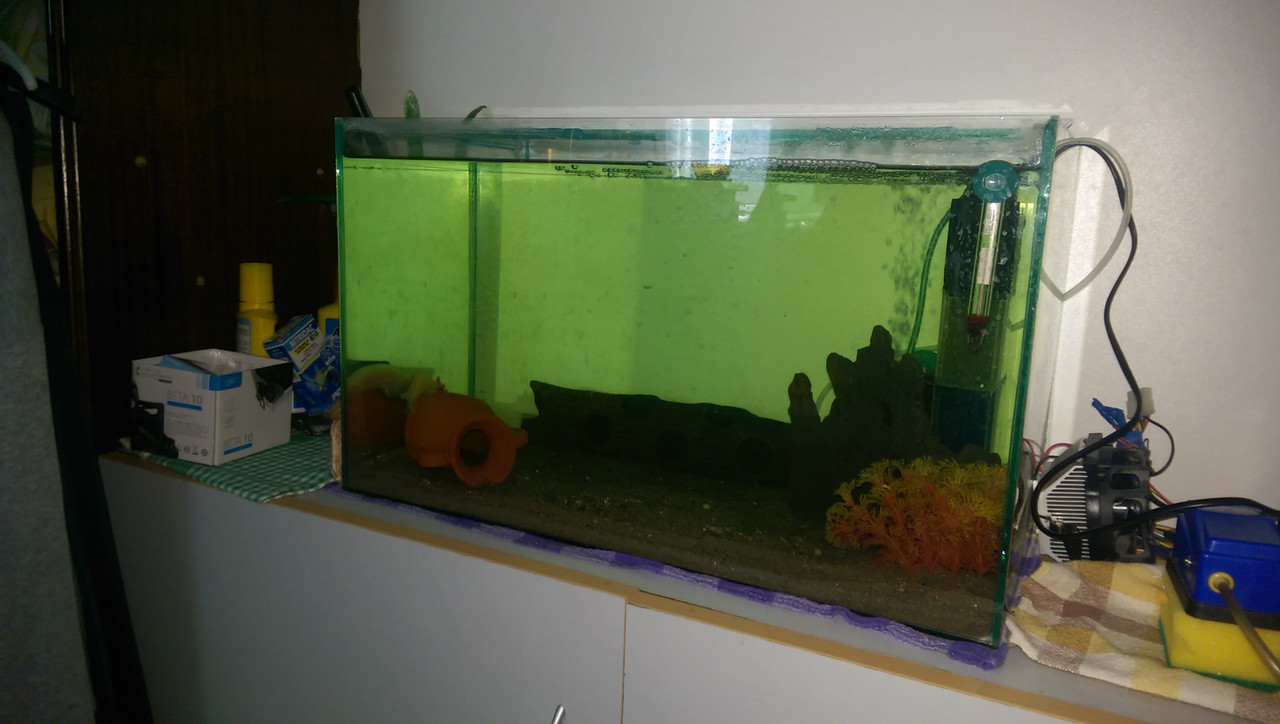 Значи все пак е от пречупването на светлината през стъклата на аквариума. Отделно самата снимка си има своите дефекти. На дневна светлина водата изглежда ОК, също и с осветление. Мен ако питаш, май си е добре водата ... поне на цвят. На живо ти някаква разлика виждаш ли сега?