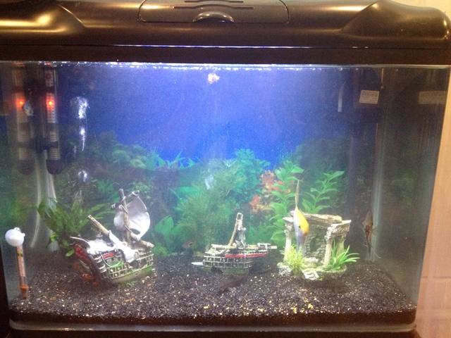 Здравейте , аз съм новичка и имам аквариума от два месеца . Той е 60 литров , с диодно осветление , вътрешен филтър , сложила съм допълнителна помпичка за въздух. Рибките са ми   или поне бяха 4 скалари , 2 сомчета , 2 трахогастера , и вече 2 гупи. Скаларията ми умря за едно денонощие , после добавих 4 - гупи и от тях две умряха. Сега имам 2 сомчета , 2 трахогастера и 2 гупи. Ще кача снимка  и се виждат 2 скаларии но ми един приятел ми ги даде от неговия аквариум и ме притеснява да не ги уморя и тях. Проблема ми е с водата поне така си мисля , сменям 30% от водата на една седмица (така ми казаха в магазина, 1 ден си е добре и след това става мътна. Единственото нещо където добавям след смяната е 2 мл. концентрат Prime. Температурата е 25 градуса. Като прегледах и другите теми , стигнах до извода ,че в този уж така добър магазин нищо не са ми казали. Нито съм преварявала подложката нищо не съм правила растенията , прибрах се вкъщи наредих го напълних го и на другия ден пуснах рибките. Как да изчистя водата да е бистра и как да си запазя рибките живи  *SORRY*