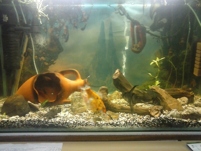 Довечера ще кача снимки на моя аквариум, вярно, че златната е една в момента, но до скоро бяха три, а с растенията които имам (два вида криптокорина, спирална и обикновена валиснерия, анубиаси-дори цъфтят, микросорум,болбитис, върбичка, паунов мъх) нямам никакъв проблем/може би малко брада/.