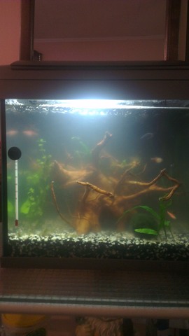 Значи , на 17.07.2014 трябваше да го рестартирам ,защото беше доста мръсен. Махнах половината вода, но всичко стана мътилка. И реших да го очистя напълно-да махна рибите, пясъка и всичко (знам ,че не трябва ,но човек се учи от грешките си). Напълних го. Сложих същия пясък, същите растения, само корена беше нов .Също сипах малко вода от друг аквариум. Трябваше да пусна рибите,защото няма къде да ги държа. Другия ми аквариум е много малък и няма място. И в началото водата стана бяла. Знам , че това е нормално , но си мислех , че до 1 максимум 2 дена ще се избистри. Но вече мина 5 ден и тя още е така. На 2 ден смених малко вода , но нищо. Стои си така както беше. Не се е променила дори и малко. Растенията ми взема да гният .И най-много ме притеснява дали ще оживеят рибите.