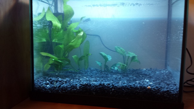 - луминисцентна лампа прикрепена към капака (дойде с аквариума), не знам колко вата е, ще питам следващия път в магазина. Знам за съотношението 0.3-0.5 W/литър.