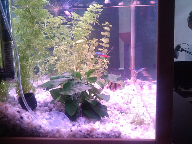Смених осветлението, казаха ми че гро-лукс е хубаво осветление, но е само за растения и то повърхностни(предимно) сега смених осветлението и кафявото по растенията взе да изчезва, сменените лампи са обикновени пури 45см 15вата 6500 келвина,  560 лумена, ще сложа и снимка с предното и сегашното осветление:)