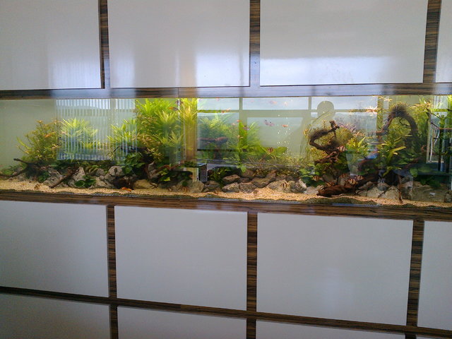 Къде си го крил до сега този аквариум?Много добре се е получил с тези 3 островчета и оформлението си е доста хубаво.И въобще ця;ата визия със шкафовете е страхотна. *BRAVO*