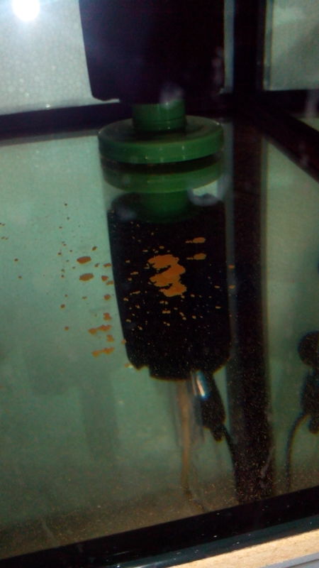 Прилича на оранжев прах, събира се за няколко дни на дъното на аквариума и се увеличава.. След сифониране и частична смяна на водата се появява отново.. В аквариума няма риби, а доскоро само два охлюва, които умряха - незнам дали е свързано с "нещото"..