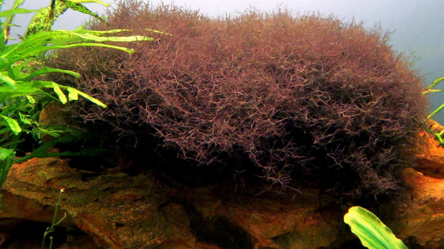 Цвета му може да варира от червено-кафяв до черен,повече зависи с каква лампа се осветява.В морска или бракична вода цвета му е светлосив до бял.Отглеждането му не е трудно.Расте много добре както в мека така и в  твърда вода.Може да се отглежда при много малко светлина без СО2 и торене,но при наличието им и силна светлина расте по-бързо и има по-добър външен вид.Отглежда се като мъховете,захваща се много здраво за дървета,камъни и други предмети.Един път захванало се за нещо е много трудно пълното му премахване.Достатъчно е да има едно малко парче от него за да се развие на ново.Растежа му е компактен,като образува гъста туфичка.