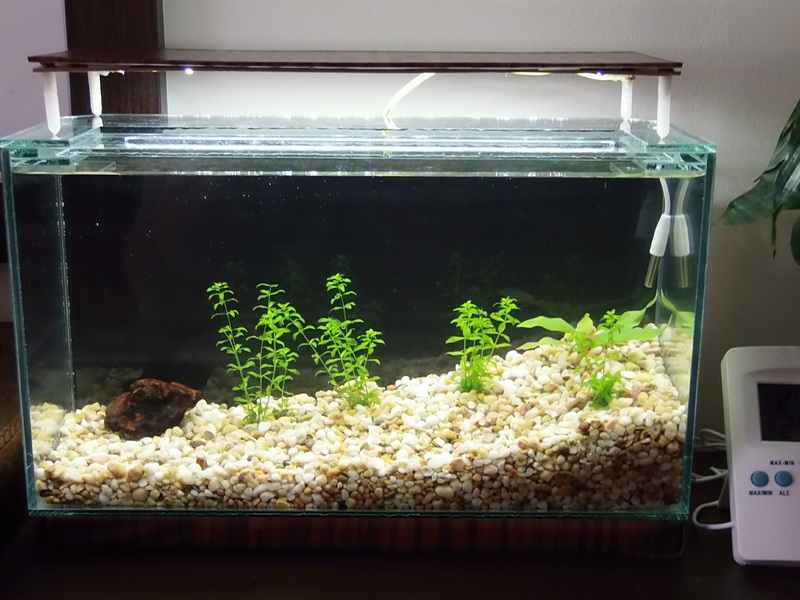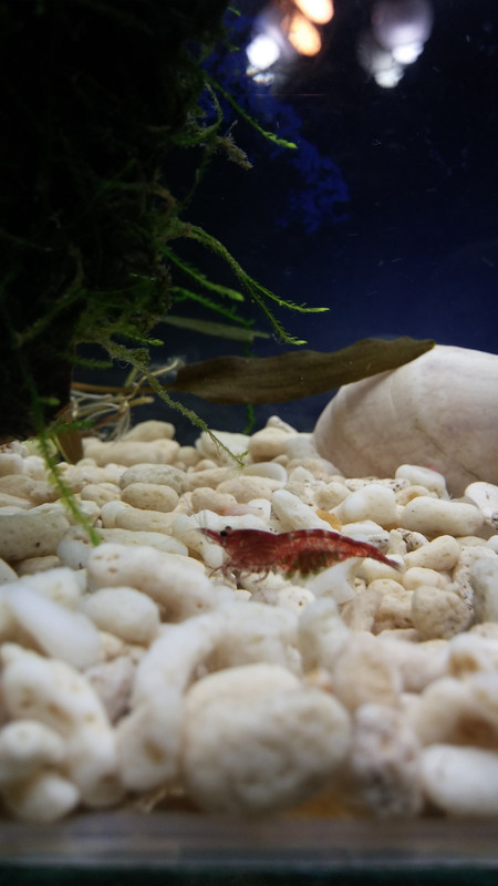 1м диодна лента е поставена да осветява аквариума. Растенията са явански мъх и едно стръкче криптокорина. Филтърът поддържа температурата относително постоянна около 22 градуса, когато е включен. С този малък нагревател не мога да се оправя, за момента е изключен. Въпреки това, като чета изискванията за скариди, може и да мина без него.