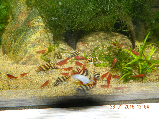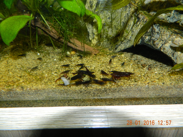 здравей, той колегата ти е казал най-важното. тези скариди са най-лесните без много изискване за водата.ядат всичко от водорасли до остатъци от храна на рибите ако има,иначе има и специална храна за тях.за рибите който ще слагаш не знам дали ще ги гонят и ядат не съм толкова запознат нямам риби ноо акще слагаш трябва да им направиш добро укритие от растения или мъхове