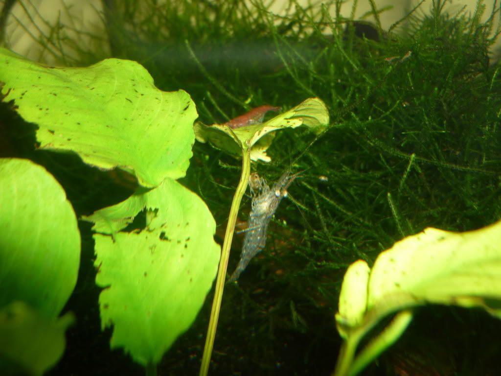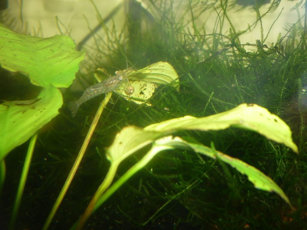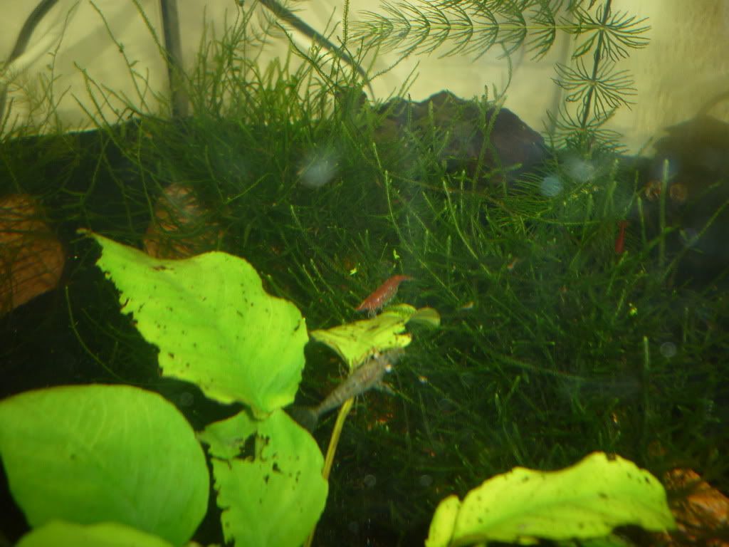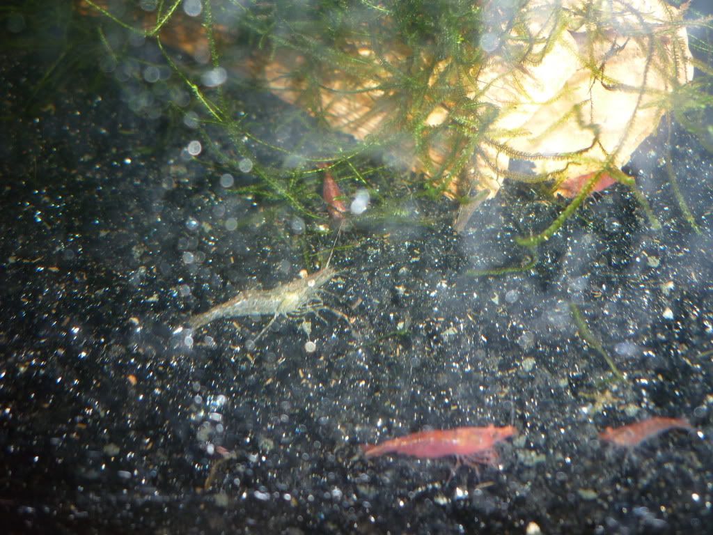 В другия скаридарник просто не се виждат заради яванския мъх - превзе ми аквариума и не съм бутал още вътре трябва да го разровя и да видя има ли още живи галактики. Веднъж в месеца виждам 1-2 да се шмугват някъде в бързината когато ги изненадам. Пък итова е гърба на аквариума - като ги местих не съм погледнал и видях чак като го напълних и ме мързи да го изпразвам за да го завъртя как трябва да е .