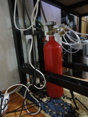 Система за СО2 под налягане, бутилка мин.вода за брояч на мехури и смесителна колона за разтваряне на СО2.