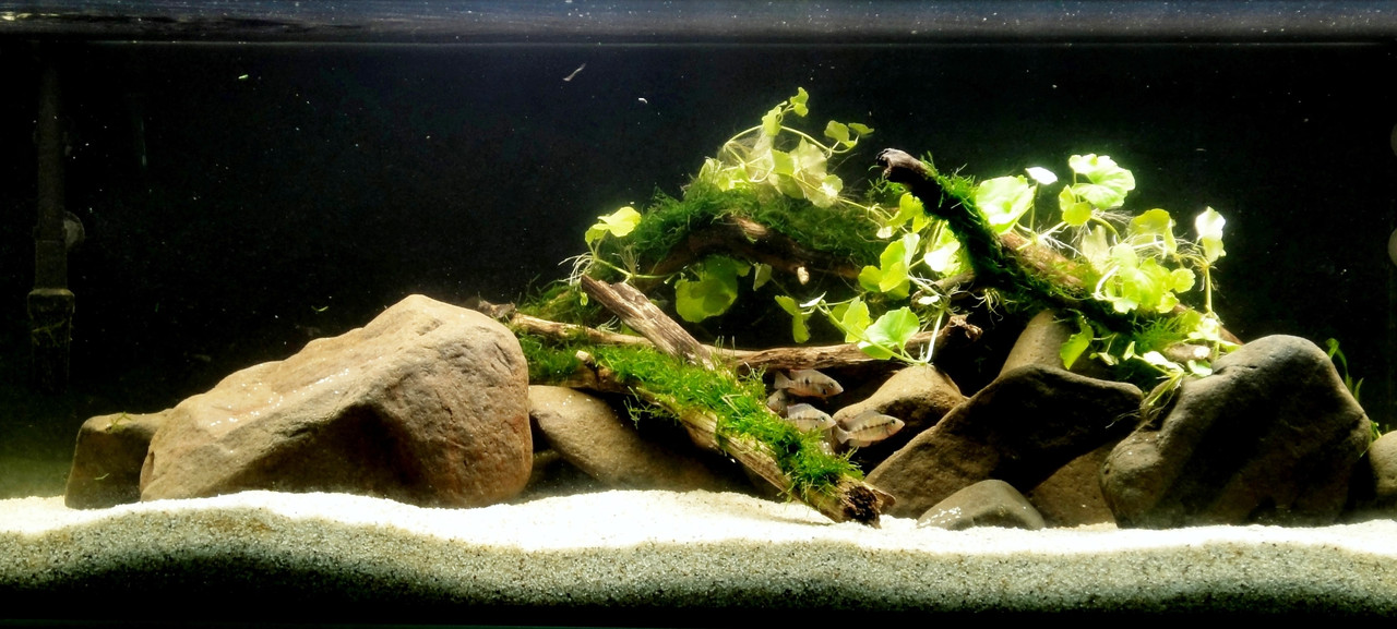 Ехе доста добре се получил аквариума! *BRAVO*Растението което е най отпред пред камъните май ще е по-добре да го преместиш отзад при останалите,че така скрива приятния изглед на заден план. *THUMBS UP*