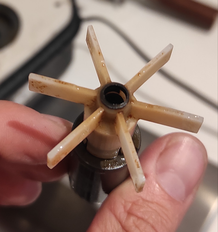 Като за 7г+ употреба и незнайно дали е отварян и как е обслужван филтъра смея да твърдя ,че работи като нов. Вярно смених смукател и изпускател защото липсваха , купих и импелер съвсем скоро защото както се вижда от снимките беше тотал. Реално в момента в който извадих повторно оста за да сложа новия - тя се спука и стана на 2 части...Но мисля ,че въртят добре водата.