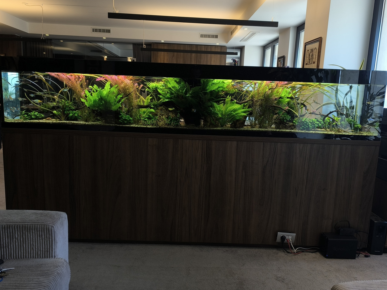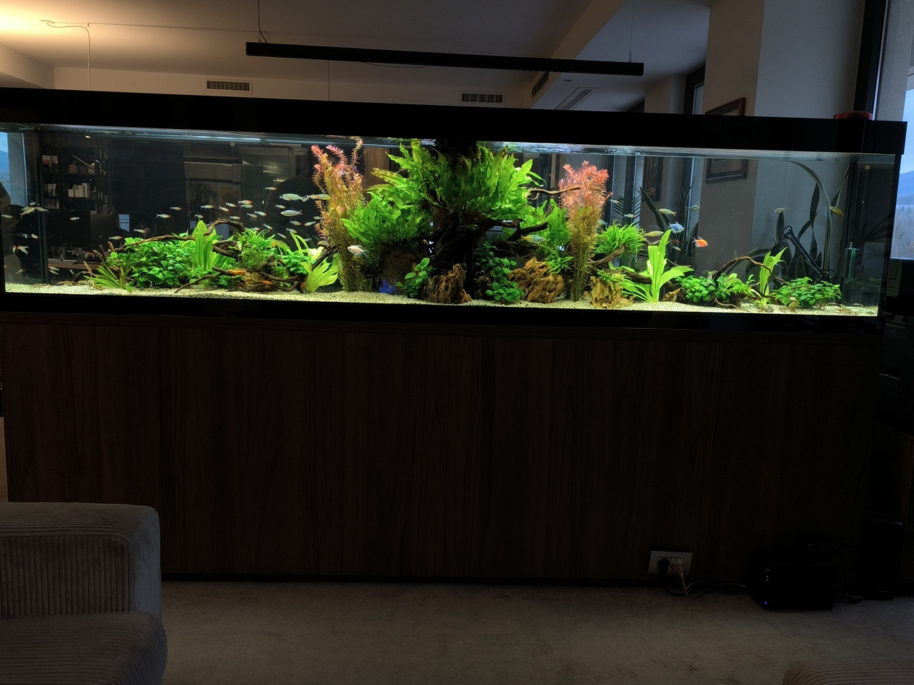Китки растат , риби и те, лек набез на зелена брада има на места по грунда и някой друг корен , но ги "лекувам".Мисля ,че филтрите на тоя етап се справят добре с филтрацията.