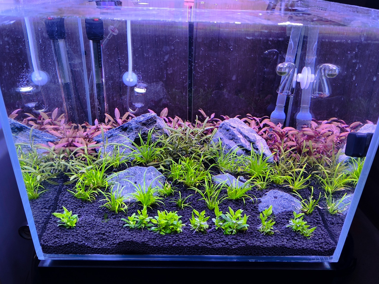 За коледа напълних и пуснах едно сравнително малко аквариумче с растителен грунд, камъни от близкия строеж и идея за ивагуми, която след слагането на китките, които бях взех се оказа ,че си стана чист холандец.