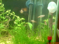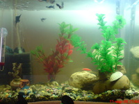има 3 бременни гупи 3 кардиналчета и 1 розово данио ( ще му купя още 1 да живеят малко отделно от мъжките че искам да ги размножа) а да има 1 охлюв и 8 малки гупи от които на въднъж виждам най-много 4 .