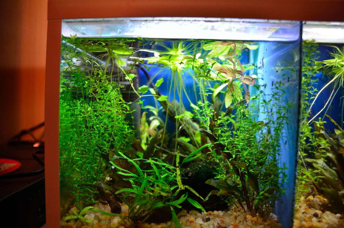 Имаше известен застой в развитието му, защото отначало започнах с неподходящо осветление, после се борих срещу бактериална ципа и нишковидни водорасли, но едно по-едно нещата се оправят и аквариумчето дръпва..