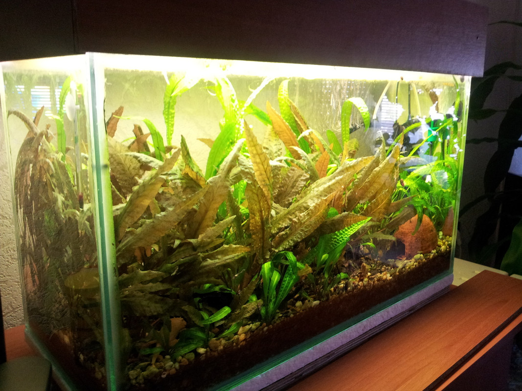 Ето го и моето аквариумче размери 63/29/35 д/ш/в ~64 литра стартиран преди седмица(имаше няколко рестарта заради проблеми в аквариума) филтър aqua el fan mini осветеление 2 пури T8 6500k нагревател - лампите стигат.Обитатели 2 хелера 2 молинезии 5 гупи 3 плати 2 анциструса.Растенията са нисички защото скоро бяха подкастрени  ;-) Очаквам критики съвети всичко  *THUMBS UP*