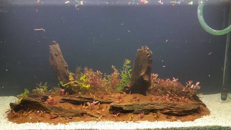 След малко измъчено засаждане в манадото и пълнене на аквариума и изкореняване на 1/3 от растенията заради лекия манадо, накрая го закрепих и напълних.