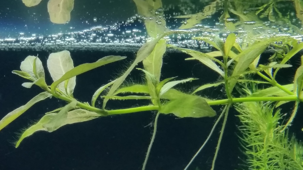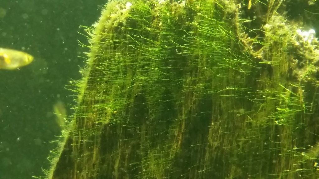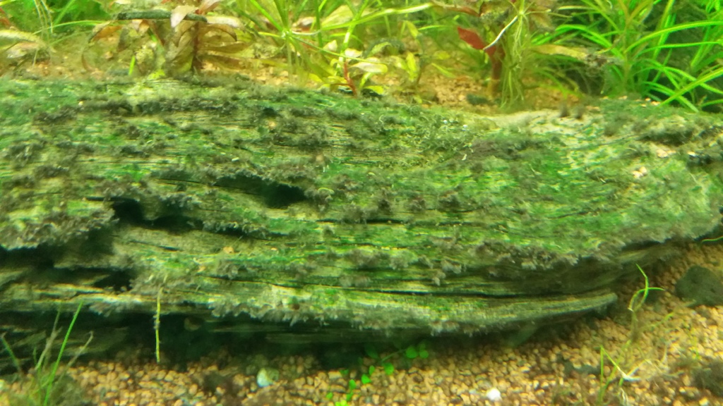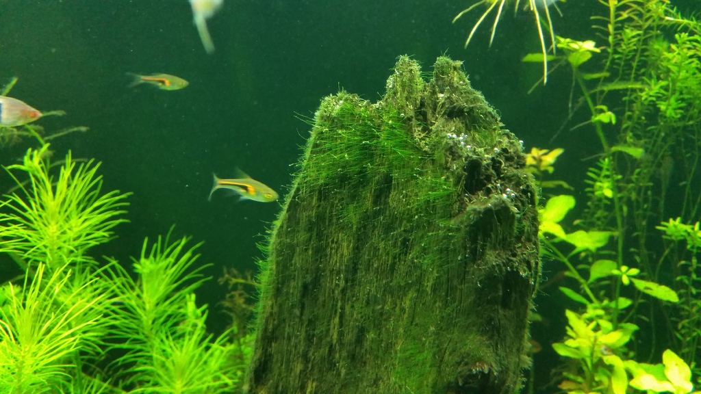 На снимката се забелязва добре развиващо се зелено водорасло върху корена. Появява се и върху новите листа много бързо и ги обхваща почти целите. Аз лично смятам че е поради излишък на органика. Може ли за органика да се счита амонякът и интритите които са тригер фактори за развитието на водораслите. Канистъра в момента е все още 2000 л/ч сън сън натъпкан с керамика и лава. Светя по 9 часа на две стъпала. Вода се старая да сменям всяка седмица по 20 процента. :)