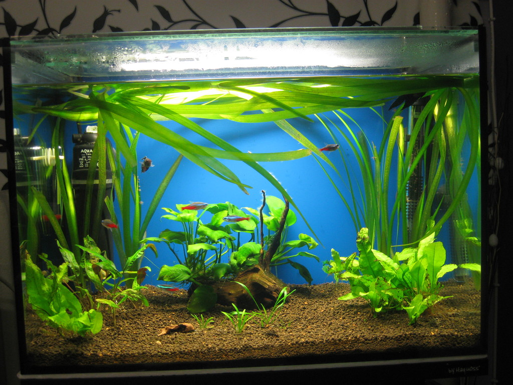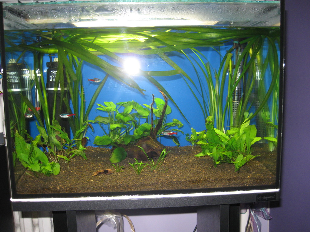 аквариум 52л.,обитатели-мъжка и женска бета,1бр.САЕ,5бр.неони,3бр.анциструси,вътрешна помпа aquael fan 1 plus,нагревател 100w,субстрат Red Bee Sand.Аквариума е на около 7месеца.Растенията са анубиас,валиснерия,папрат забравих каква и два три стръка от една тревичка,осветление 24w то е малко слабо.
