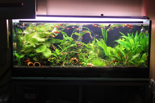 Аквариума беше доста позанемарен известно време, след нападението от черна брада изгубих ентусиазъм и нещата отидоха доста на зле изгубих 70 процента от растенията сигурно и така беше повече от година на самотек без въглероден диоксид без торене без редовна смяна на вода, В един момент реших че ще го възстановялПостепенно започнах да третирам черната брада локално със кислородна вода както и със изи карболМалко по малко брадата започна да намалява и почти изчезна, същевременно започнах редовни смени на водата и нещата започнаха да се наместватрДва месеца по късно добавих бързорастящи растения и започнах торене със микро и макро елементи, като постепенно увеличих дозата. В момента нитратите са 50ппм а фосфатите между 2и 5 ппм.Смените на водата ги правя с престояла чешмяна вода като добавям денерле реосмозис защото ТДС на водата в Кюстендил е 19. В момента растенията се развиват доста добре!