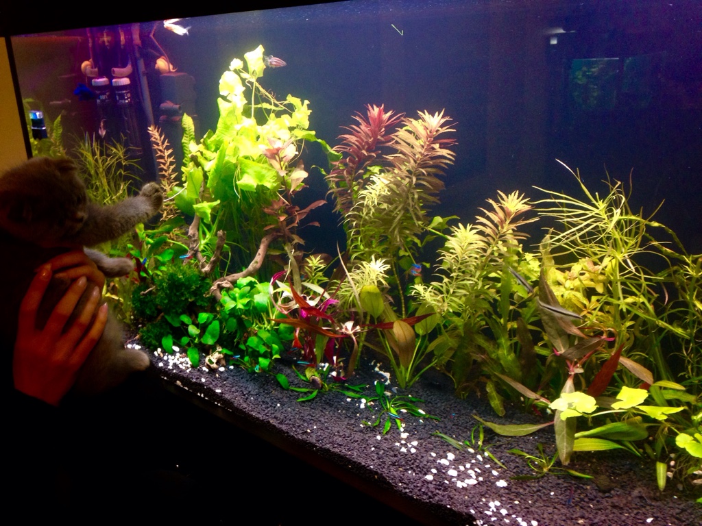 Снимка с добавеното осветление (общо вече 172 вата) , новите китки, още грунд и някоя друга нова рибка . Взех 3 САЕ защото има вероятност да тръгне брадица след смяната и мътилката която се вдигна. Сега остава растенията да се стабилизират , някой криптокорини гледам май ще се скапват ама ще го преживеем.