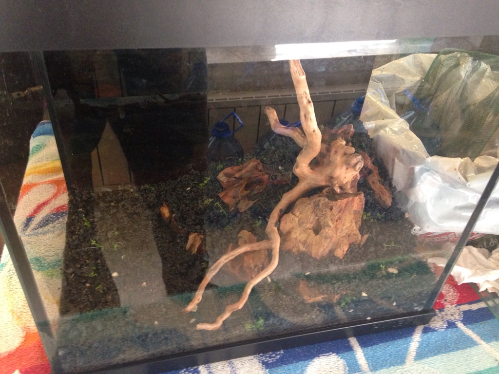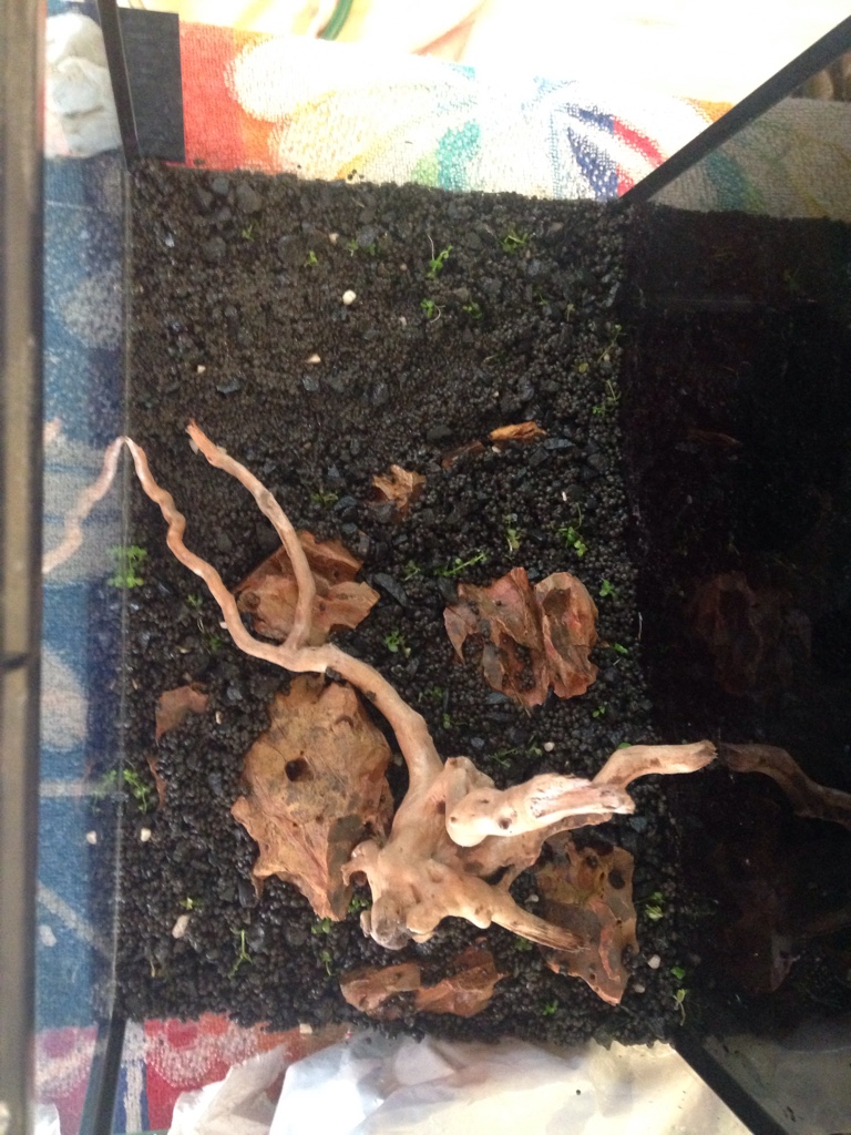 В наното ... Всички скариди са мор , останали са 3 галаксита и 3 пигмея , анцитруса и отоцинкуса , жената е махнала корена и изхвърлила папратите и мъховете. На повърхността има ципа , твърда даже , а уж флейтата е насочена и движи повърхността ... От монте карлото има доста поизгнило , тук таме нишковидни... Не виждам нова издънка!