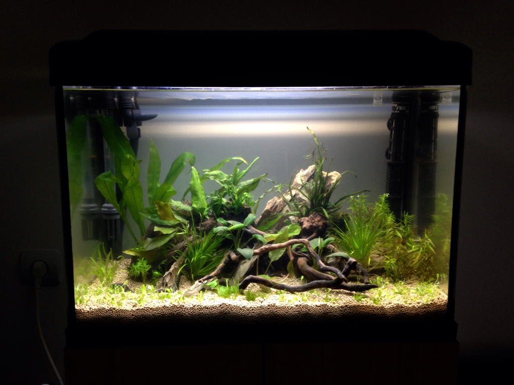 Не е ясно още , бавен ще е на първо време , сложих ехинодоруси ама са от големия и са бая мутирали , микрозоруми , анубиаси ... Мислим го в движение ..