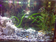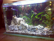 Здравейте, това е първия ми аквариум. 78 л. 65/30/40. Имаше няколко пренареждания  :-). Това е последно от вчера. Камъка го мих с домашна пароструйка, нямате идея колко мръсотия пусна. Обитатели: 4 трихогастера , 3 макропода, 3 бети - една мъжка , две женски, 10 неона, 2 анцитруса, 2 коридоруса. Филтъра е вътрешен - Ехем 2008. Нагревател 100 W. Осветлението е две шини по 18 W T4. За растенията и аз не знам какви са. 4 вида са. Плс препоръки и коментари.