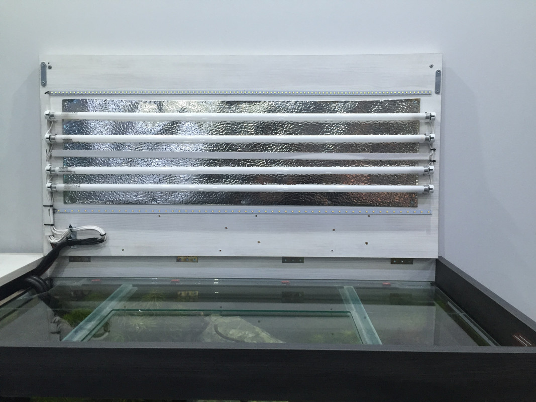 Осветление : 4 луминисцентни пури Т5 по 39 W 2 - 865 + 2 - 840 допълнително имам и две диодни ленти по 11 W отново едната 840 другата 850 ( на два кръга )