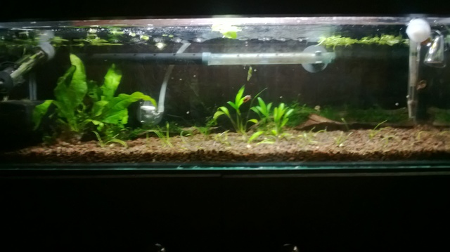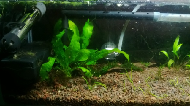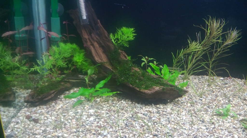 засадих малко растения ( с толкова разполагам )  гигантска валиснерия , криптокорин гриин уенди хибрид , страуроджин няколко корена , лилеоприс бразиленсис , корен с коледен мъх , корен с фосиденс фонтанус , хотония палустрис ,погостемон стелатус , нимфея лотос , ехинодорус ( не му знам вида ) криптокорина парва ,ехинодорус тенелус , лудвигия палустрис