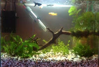 Добър вечер рибките се държат странно седят само на дъното като им дам храна отиват на повърхността и ядът, през седмица сменям 7 литра а през три дни по 2-3 литра (аквата е само 27 л :( )има гъба с помпичка за въздух и филтър някой да знае нещо ? И вторият ми въпрос е дали осветлението е достатъчно - 8W луминисцентна лампа пура ? Мерси предварително скоро ще кача и някоя снимка на развитието.