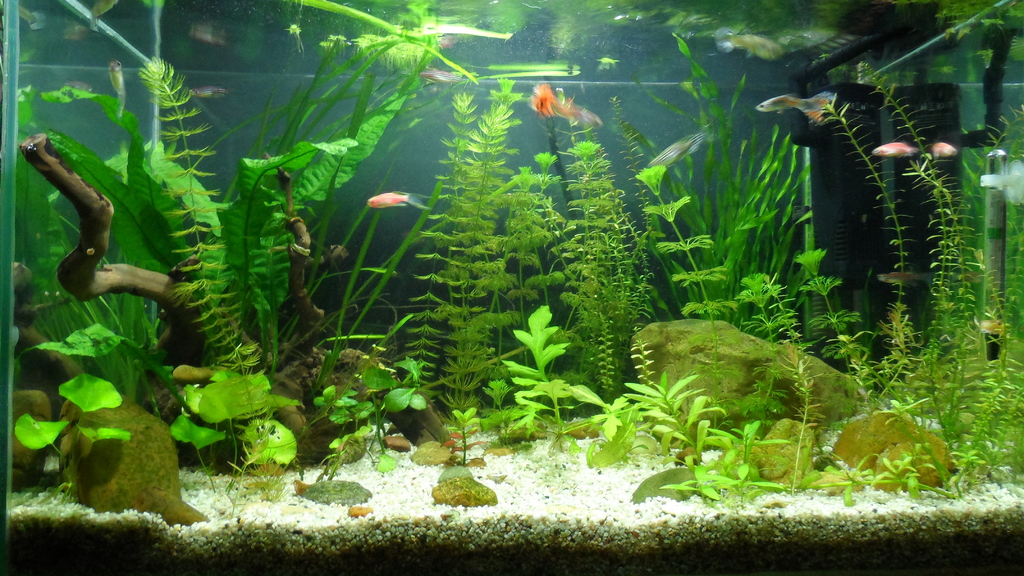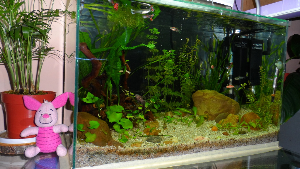 Хайде една снимка и от мен. Мини джунглата лека полека се развива. С изненада установих, че микрозорума пуска 2 нови листа. Роголистника го застопурих на дъното, че много взе да обикаля из аквариума. А от няколко дена имам и 5-6 бебока гупи :)