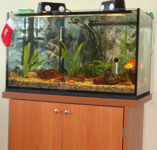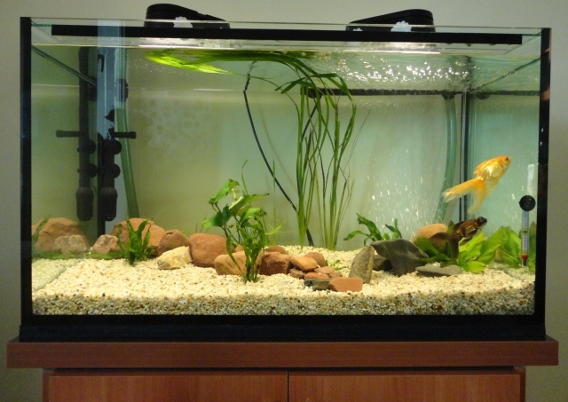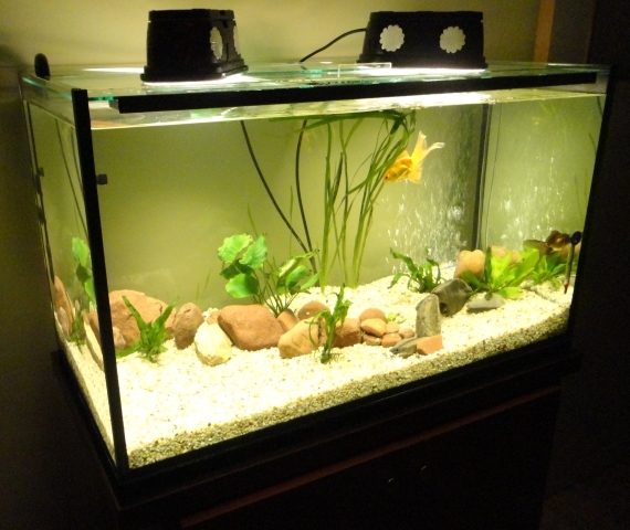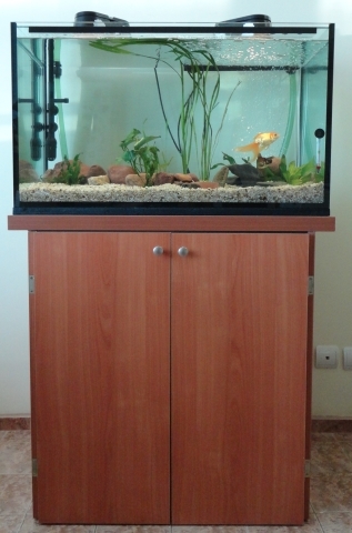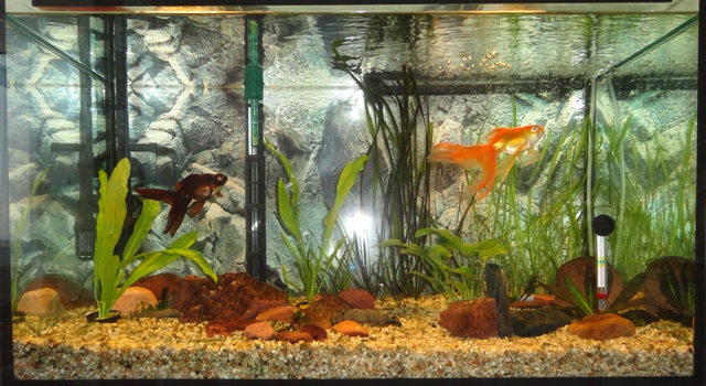 Обитатели: 2 бр. златни рибки (телескоп и воална). Възнамерявам да сложа още една златна (червена шапка) и два сома коридорас панда (макар че вече имах проблеми с анциструс - нападаше златните, при коридорасите се притеснавам от обратното). Други риби който харесвам са неони, дискуси и цихлиди но нямам място за голям аквариум. Може би по натам.