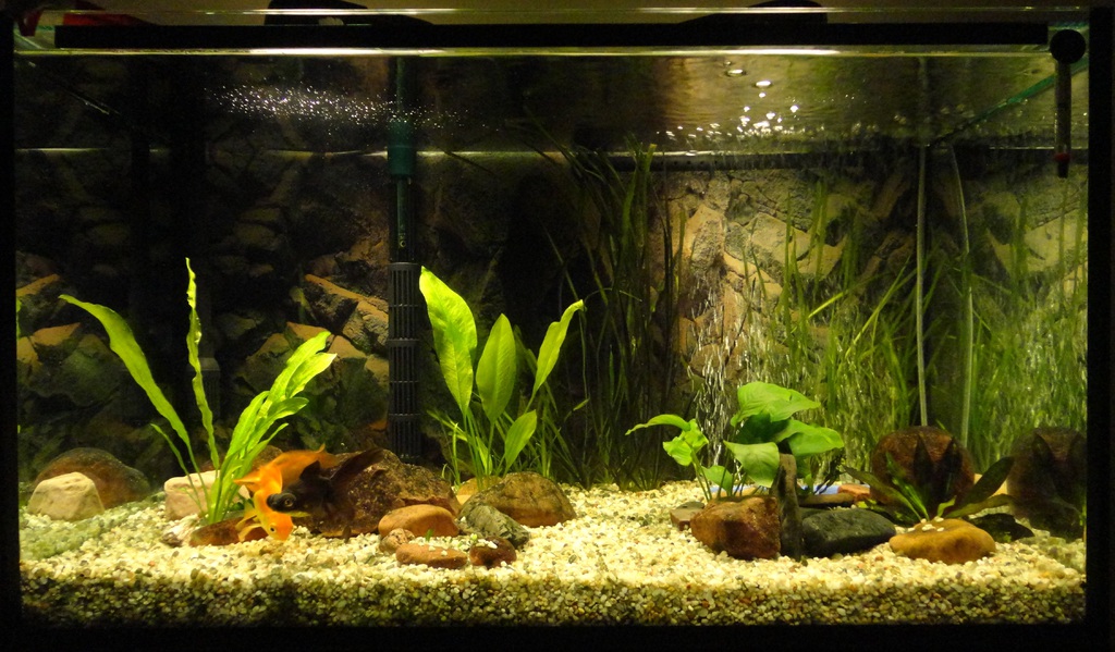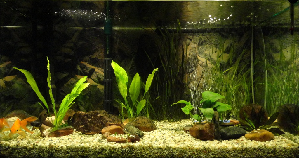 От към растения имам за момента от стария аквариум микрозорум-3 бр., анубиас-1 бр., ехинодорус-1 бр., валиснерия - 4-5 корена. (залиняли са но в стария аквариум осветлението беше много силно филтрацията беше собствено производство и имах много водорасли преди да прехвърля растенията в новия ги чистих и ги понакъсах) Иначе се съобразявам се с това видовете растенията да могат устоят на набезите на златните, но като цяло не се получава доста ги пасат (изключение прави анубиаса - въобще не го закачат). Възнамерявам да увелича бройката на растенията искам да слагам и мъх който да привържа към декорацията.