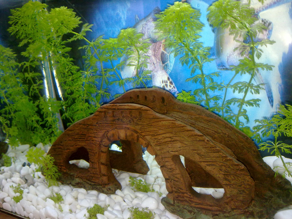 Торя с Dajana Pet Профлор по описания на листовката начин.Лампата свети по 8 часа дневно, а водата е сменям през ден по 1/3 .Понеже аквариума е малък няма да взимам пак златни.Насочил съм се към данио или кардинал.Мисля да ги купя и пусна през третата седмица.Надявам се в скоро време да взема по-голям аквариум и тогава ще сменя моста(купих го малко преди да намеря форума) с корен :-) . Отворен съм към съвети и градивни критики!