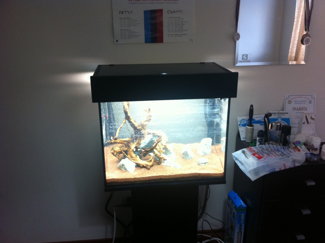 Риби, разбира се, в момента няма, мисля да го карам по учебник. След около месец мисля да сложа различни тетри, отоцинклуси и коридорас и може би черита  *dontknow*.