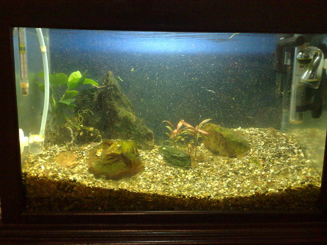 Отовците снощи преди да загаснат лампите много се гониха един друг. Видимо единия дразнеше другия да го преследва. Голямо танцуване беше но незнам дали ще излезе нещо. По четеното из интернет от мен и гледани снимки би трябвало по едрото да е женска. Но при мен по дребното надува корем. Предполагам, че е от хайвер (едва ли има газове  *ROFL*) ще ги наблюдавам да видя дали ще хвърлят нещо. Наблюдавам по дребното с подутия корем започва да се задържа все повече на растения с широки листа. За това и не махам анубиаса, залепя се от долната страна на листото и си седи там.