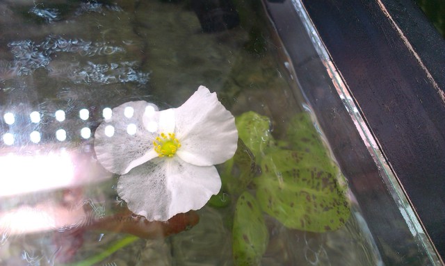 Това е една от издънките на 5 годишния Ехинодорус в друг аквариум в офиса ми. Както се вижда от втората снимка има два филиза, единия вече се нацъфтя и съм го потопил под вода, но пак изкара цвят (на първата снимка), втория тепърва ще започва да изкарва цветове. Предполагам не само на мен ми изглежда, че не само няма да умре, но и се развива чудесно! Така, че подобно твърдение е крайно нелогично.
