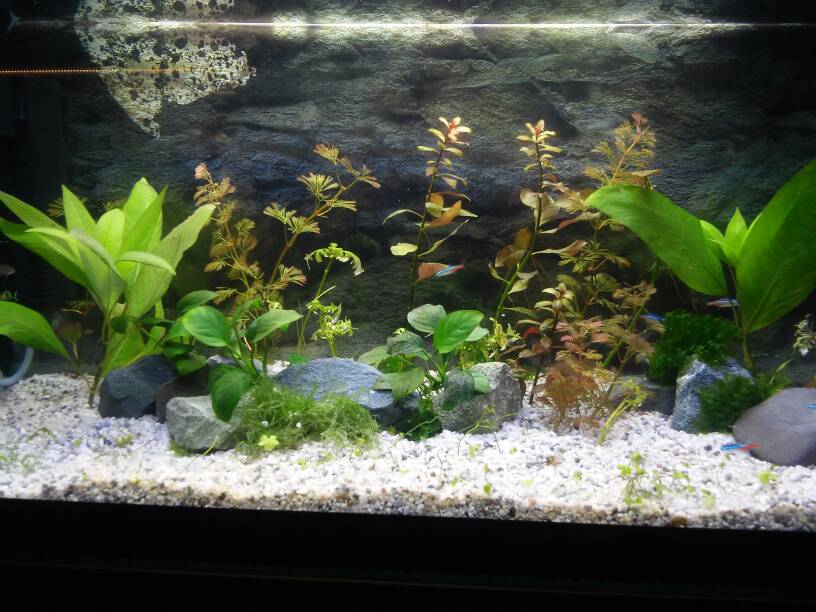Почти два месеца след стартирането на аквата. Преди няколко дни ми подариха корен с издънка криптокорина. Както се вижда едни растения са тръгнали да растат други тръгнаха към коша за мое съжаление. От почти две седмици торя активно но май започнах късно за кабомбата и някой други растения. Имах наченки на кафеви водорали който след започване на торене се махнаха...поне от стъклата. Мъховете потръгнаха, анубисите пускат по ново листо всяка седмица. Лимончето също се развива и след торенето новите листа нямат дупки и са свежи. Обмислям премахването на лумисцентното осветление и преминаване изцяло на диодно( на заплата ще наръчвам диодите и драйверите - 27 броя по 3w). Към края на месеца ще имам още "зарзават", както и обмислям още нови обитатели - 10 броя Родостомоси или Кардинали. На по късен етап обмислям и Ред Черита да пусна и на този етап това са ми плановете.