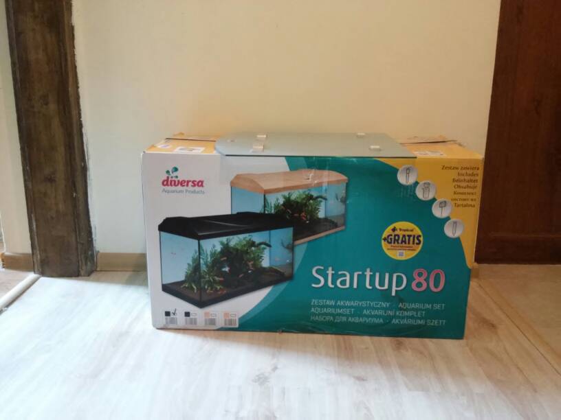 Искрата в мен бе пламнала на ново и започнах да чета и да се оглеждам за 100-150 литра аквариум. След известно четене и търсене първоначално се бях навил за поръчка на аквариум от един от колегите тук. Един ден, обаче ми попадна оферта за фирмен аквариум DIVERSA с прилежащо оборудване и го отнесох без да му мисля много много. Размерите са му 80×35×40. Оборудван с вътрешен филтър Claro 1000 литра на час. Нагревател Termo Plus 100 W с термо регулатор. Осветлението е лумисцентно 2 × 18W T13.