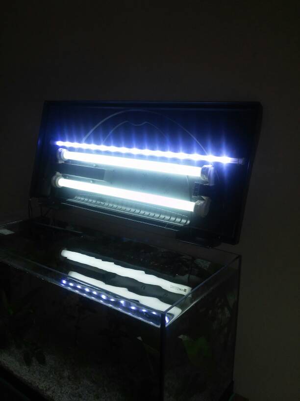 Да повдигбем малко темата. Вече съм с работеща система за CO2 и леко засилено осветление. За сега е само пробно как ще се получи. Засилването се изразява че добавих 6 Led по 1 w от една бракувана подсветка на телевизор. Обмислям LED- довете да ги направя 18 броя и заедно с лумисцентното 2×18W да приключа с осветлението.