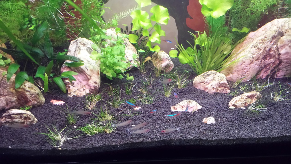 Oбитателите са 25 броя родостомуси и също толкова неонки (обикновен неон), а растенията се виждат ..