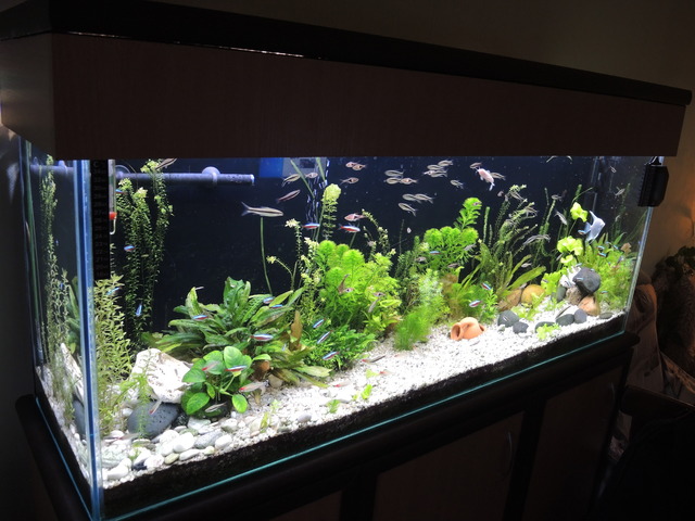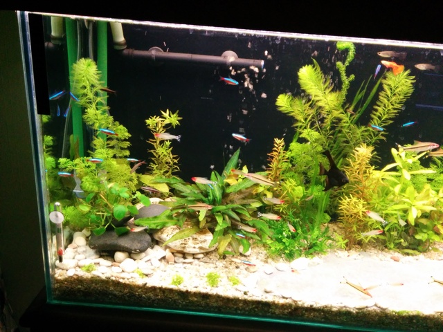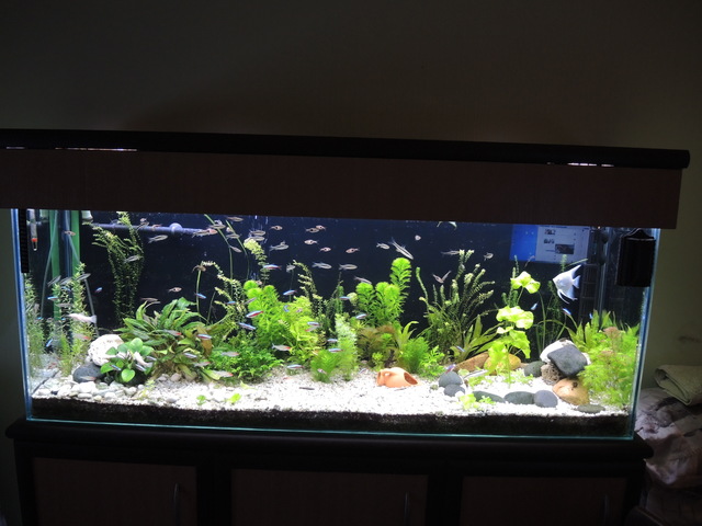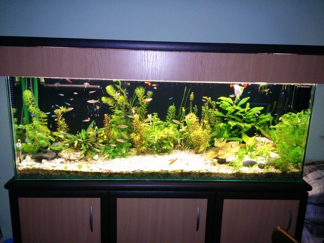 Аквариума е хубав,но мисля че трябва да намалиш видовете риби,които имаш.За полянката,мислил ли си как ще махнеш мрежата след като растението прорасте през нея?Това,което си направил с мрежата,май се прави със стъкло. *DRINK*