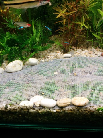 А за да не се чудите за какво съм сложил тази мрежа по средата на аквариума (малка импровизация). Много искам да стане полянка от  Hemianthus callitrichoides ''Cuba' и затова съм сложил тази мрежа, да може да се вкорени преди да бъде изровено от рибите.