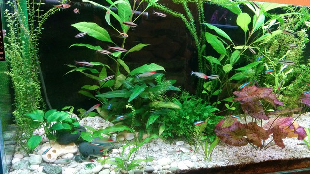Да допълня и подчертая, че за да са добре рибите, трябва да им се сменя честичко водата. Аз в момента поддържам два аквариума и практикувам 2 смени в седмицата по 40-50 %. Това е добре за рибките, но не толкова за растенията (по-принцип). Уловката при мен е че в единият нямам растения, а в другият са непретенциозни и поне до момента нямам проблеми.