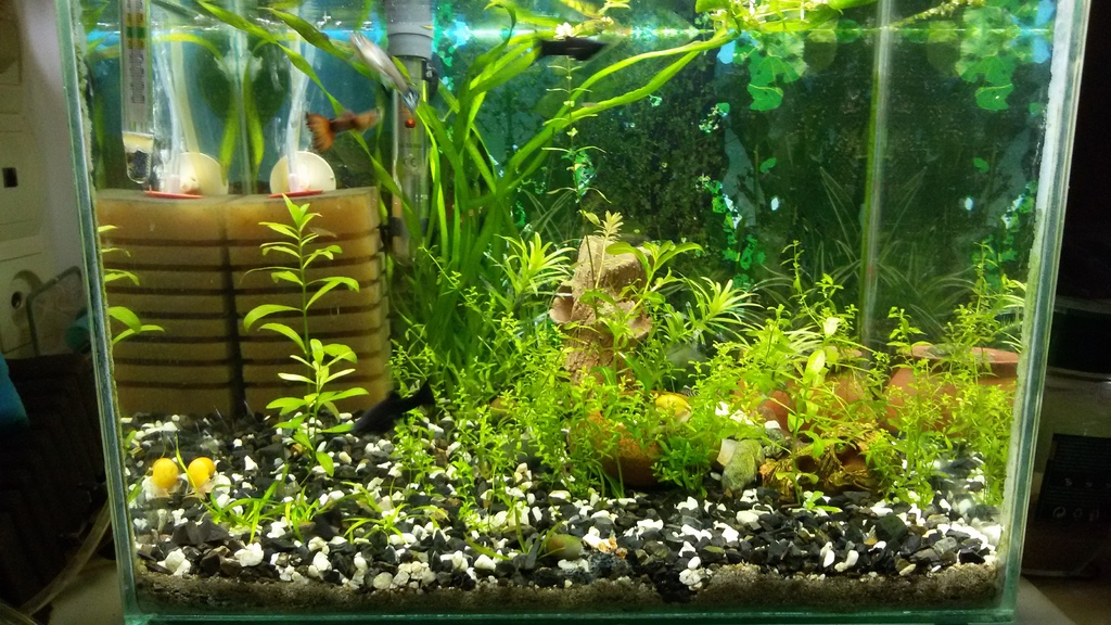 Бюджетът не е особено голям, със безработна съпруга и 3 годишно дете, но отделям по нещо все пак. Имам един вътрешен филтър на Resun 700 л/ч., който идва твърде голям, даже се вижда на една от снимките, бях го сложил, но въртеше рибите като в пералня и го махнах. Вчера си купих един 380 л/ч., пак на Resun, сложих го в 40 литровия, но пък той има много малко място за медия. Бяха му сложили гъба и активен въглен, махнах активния въглен и сложих още една гъбичка вътре. Ако не ми хареса, евентуално, може да го преправя, да махна кутията и да забуча една гъба отдолу. Даже пуснах вътре една молинезия - родилка, като роди ще оставя малките, а нея ще я върна в другия аквариум. Искам да попитам, понеже в 40 литровия имам само растения, като сменям водата, вадя 10 литра от този с рибките и я сипвам в този с растенията, а на този с рибките сипвам престояла чешмяна вода. Това правилно ли е?
