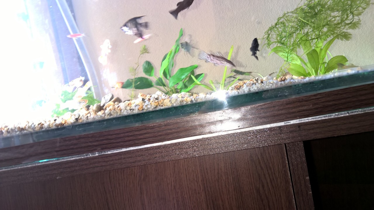 Не се вижда и дали си сложил подложка под аквариума над щкафа , но ако нямаш това е първото нещо , фибран , стериопор ... Нещо от този сорт